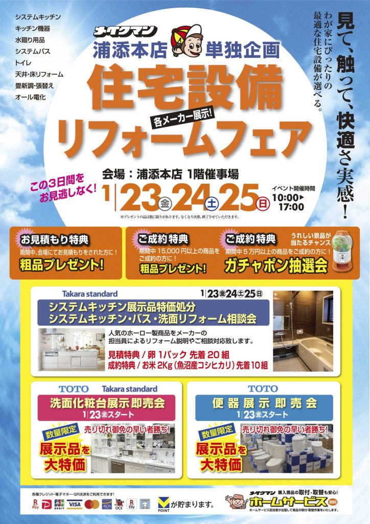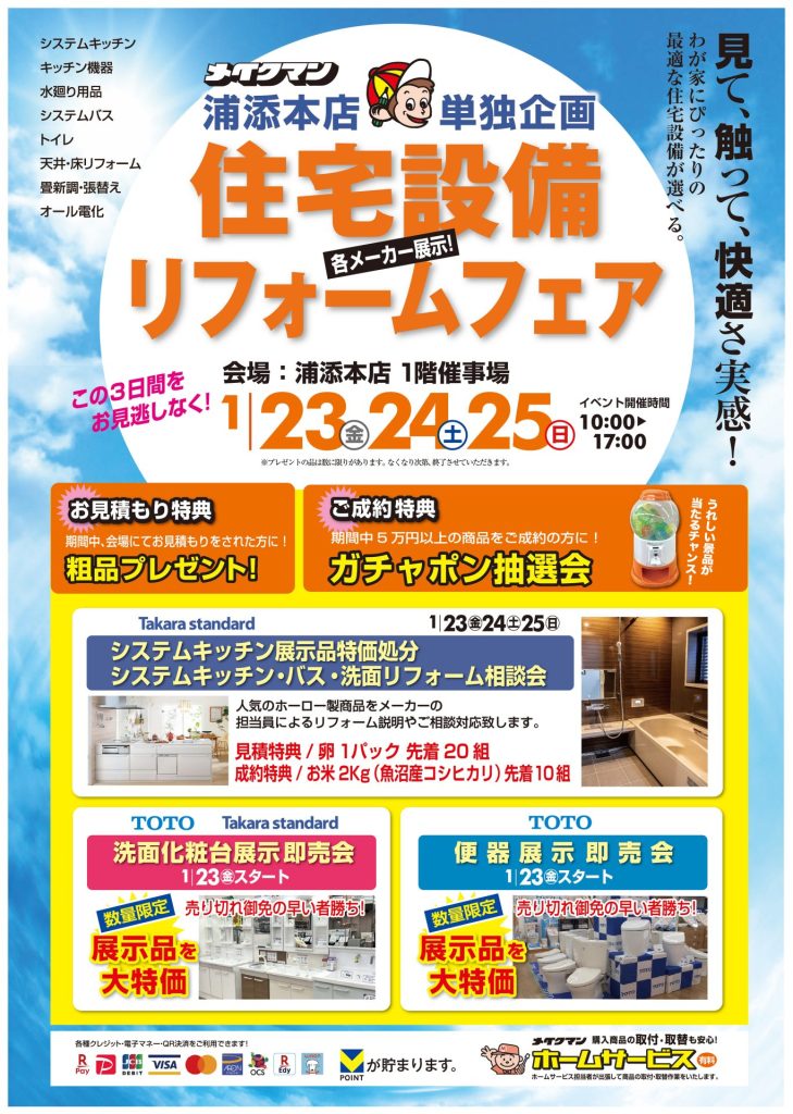 「見て、触って、快適さを実感!」をテーマに、有名メーカーさんによる展示販売・相談会・実演などをおこないます。また、洗面化粧台や便器の展示即売会を大特価で販売!!数量限定のため、売り切れ御免の早い者勝ちとなります!