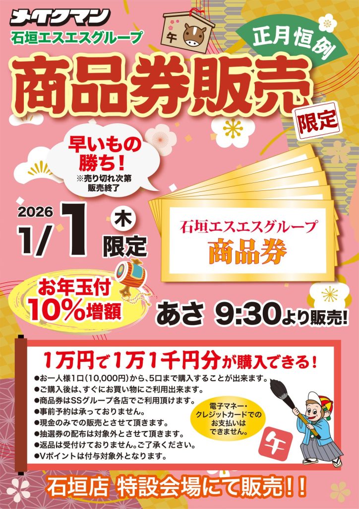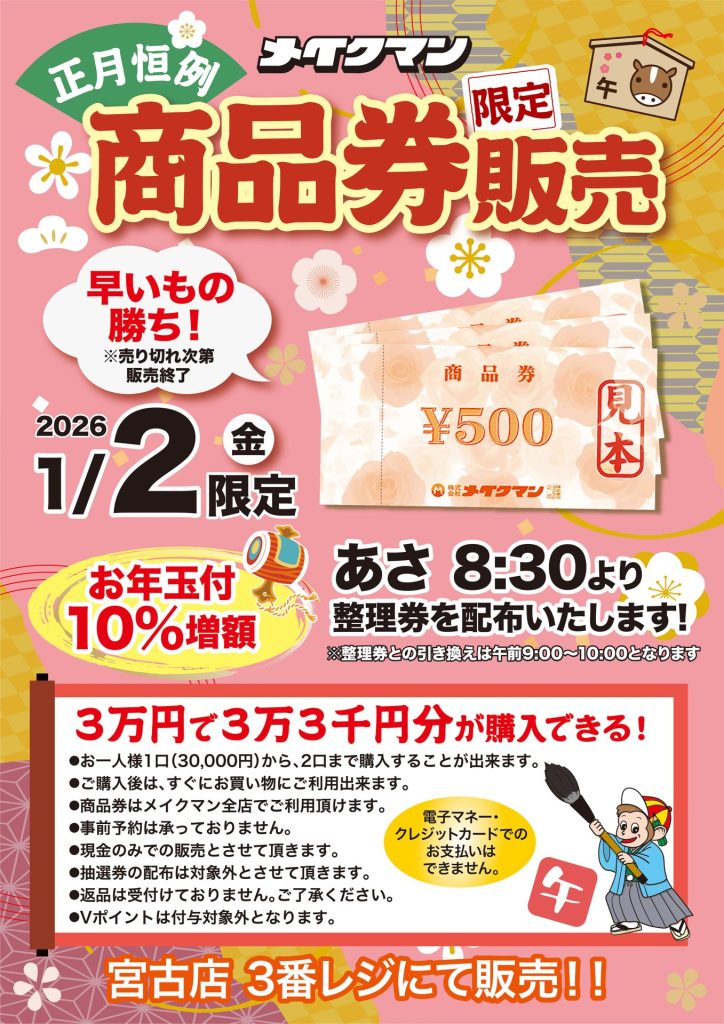 お正月恒例!2026年1月2日(金)にて商品券を販売いたします。1口(30,000円)で33,000円分が購入できます。(2口まで購入可)※売り切れ次第販売終了となります。