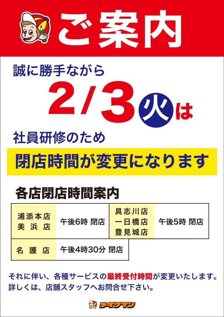 本島6店舗 2/3(火)営業時間変更のお知らせ