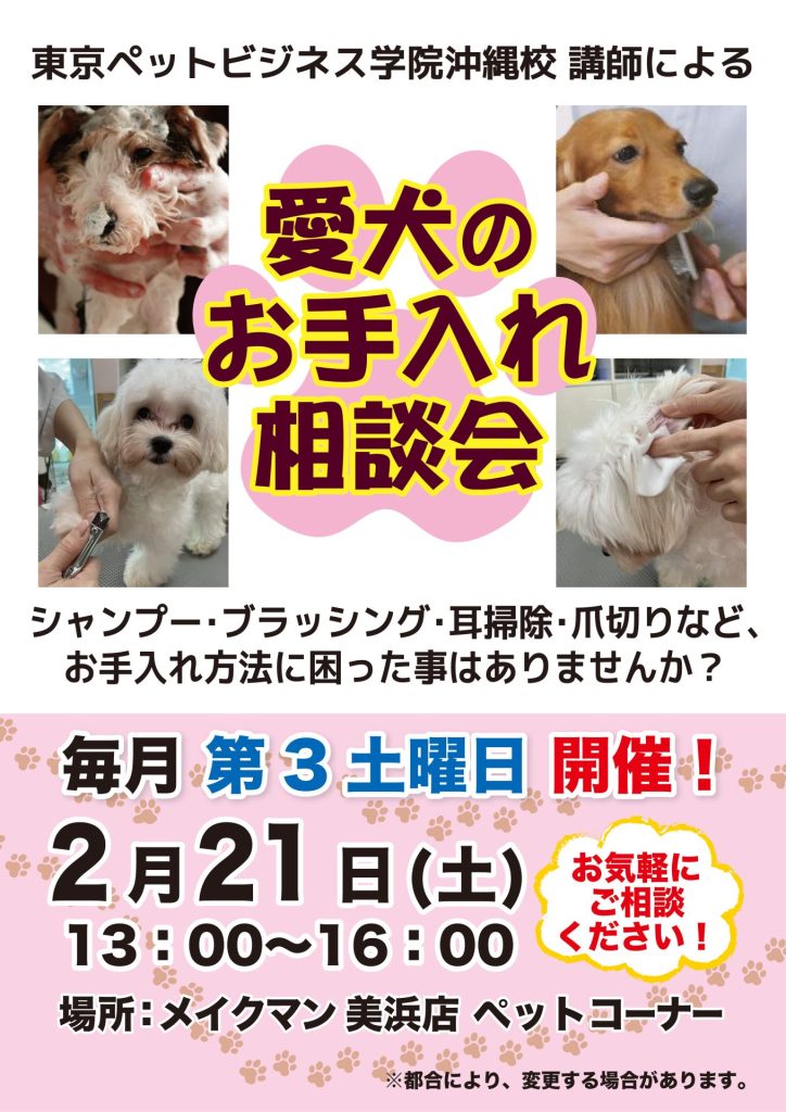 愛犬のお手入れ相談会 美浜店 ペット シャンプー・ブラッシング・耳掃除・爪切りなどお手入れ方法を、東京ペットビジネス学院沖縄校の講師による相談会を開催します。お気軽にご相談ください! 美浜店 02月21日 イベントをシェアする Facebook Twitter LINE